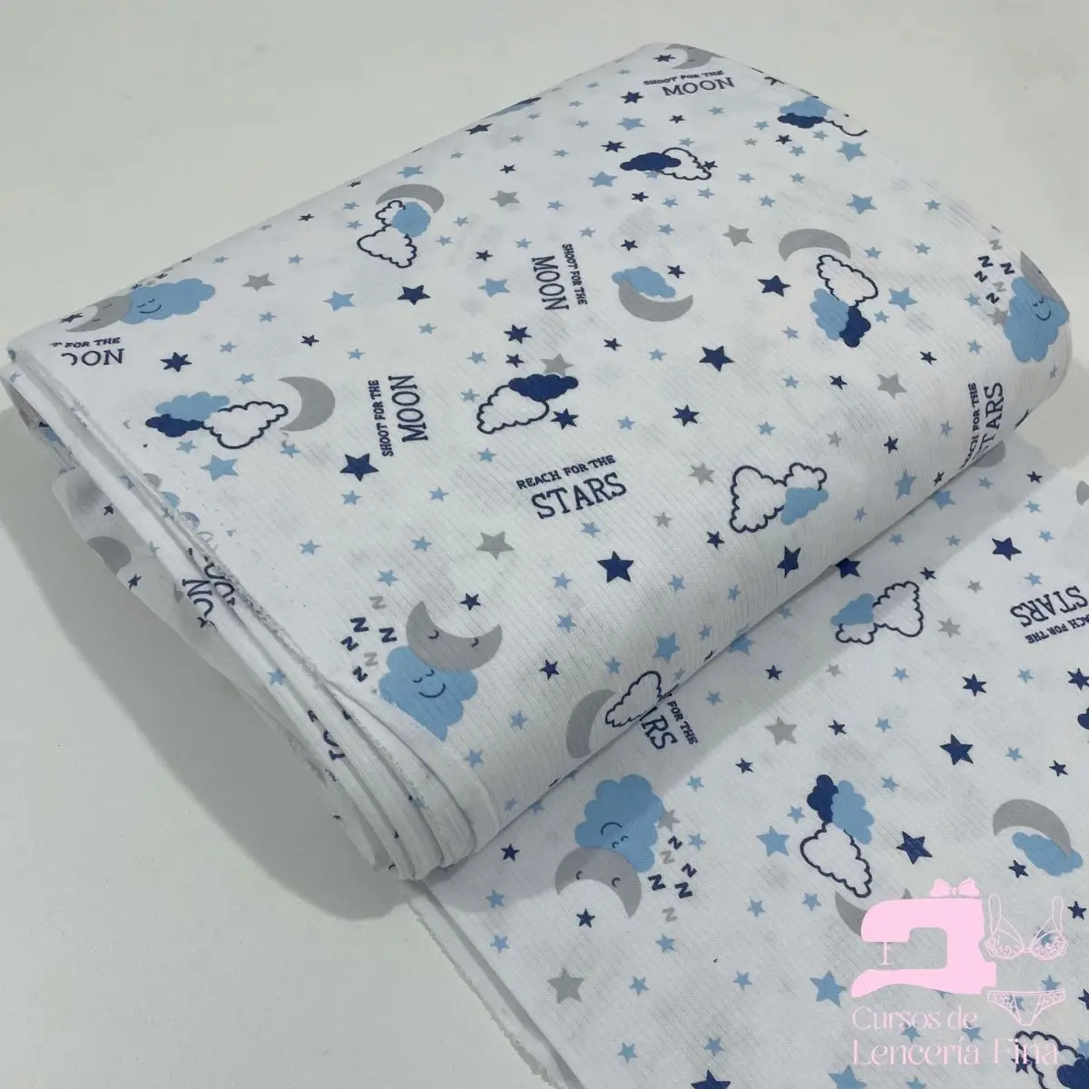 Tela de algodón jersey acanalado estampado con diseño Nubes Azul Noche. Tela 100% natural de fibra de algodón con textura acanalada que aporta elasticidad natural y un aspecto distintivo. Ideal para ropa interior infantil, pijamas y prendas casuales. Suave, transpirable y resistente al lavado.