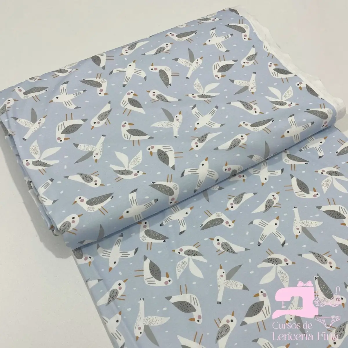 Tela de algodón jersey gamuza 50/1 estampado con diseño Gaviota. Tela 100% natural de fibra de algodón con acabado tipo gamuza, suave y aterciopelada al tacto. Ideal para confección de ropa interior infantil, pijamas y prendas cómodas. Hipoalergénica, transpirable y de fácil cuidado.