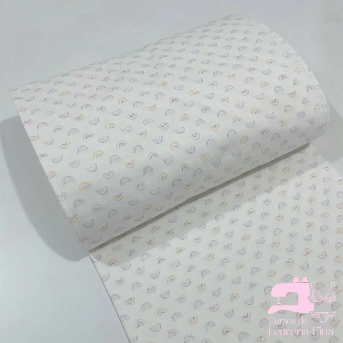 Tela de algodón jersey gamuza 50/1 estampado con diseño Mini Arcoiris. Tela 100% natural de fibra de algodón con acabado tipo gamuza, suave y aterciopelada al tacto. Ideal para confección de ropa interior infantil, pijamas y prendas cómodas. Hipoalergénica, transpirable y de fácil cuidado.