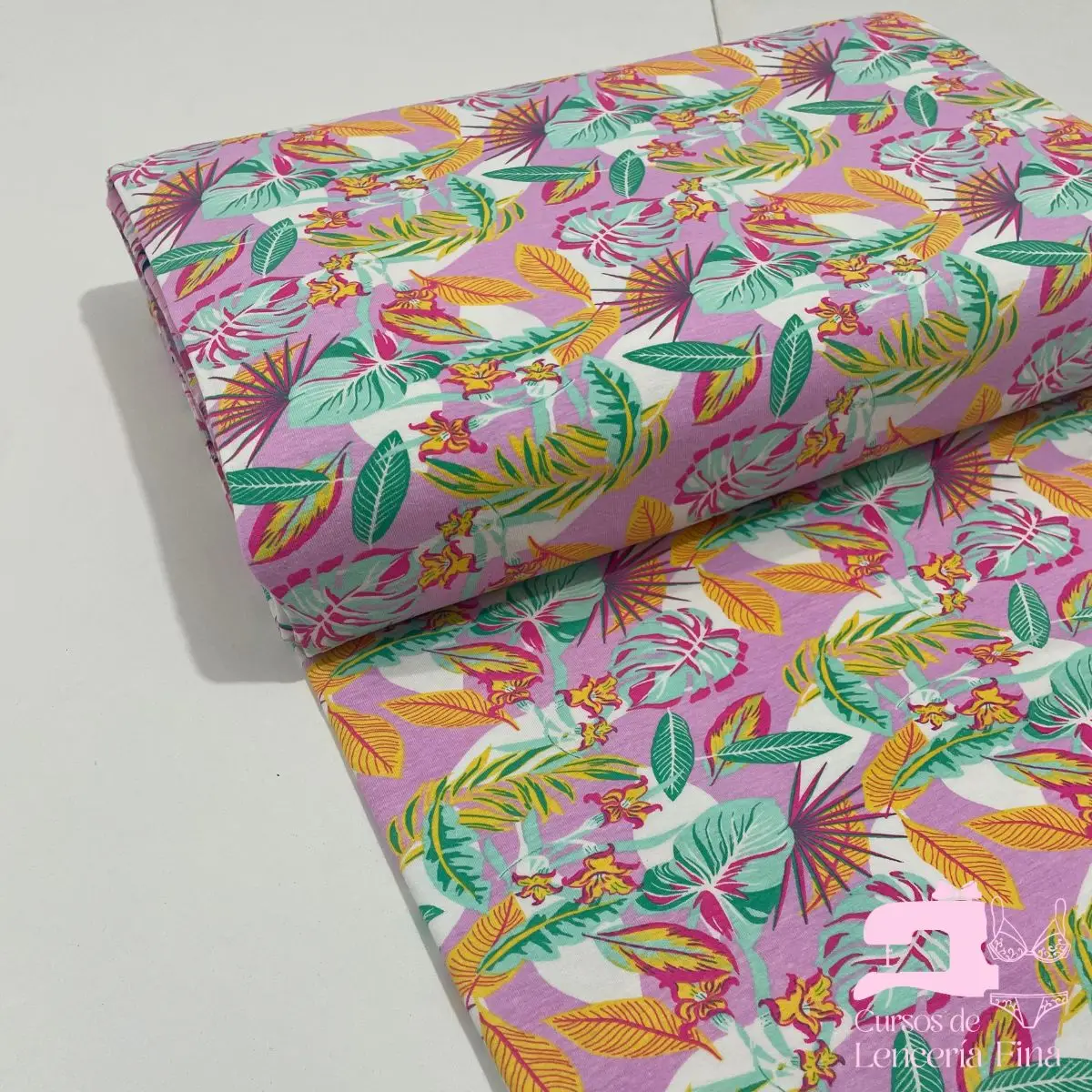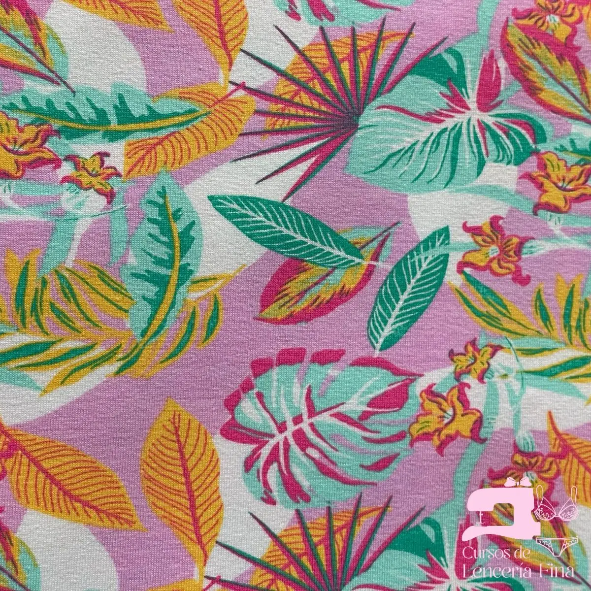 Tela de algodón licrado estampado con diseño Palmeras Verde Jade con Ambar. Combina las propiedades naturales del algodón con la elasticidad del spandex, ofreciendo comodidad y flexibilidad. Ideal para confección de trusas, brasieres y ropa interior infantil. Suave al tacto, transpirable y resistente al lavado.