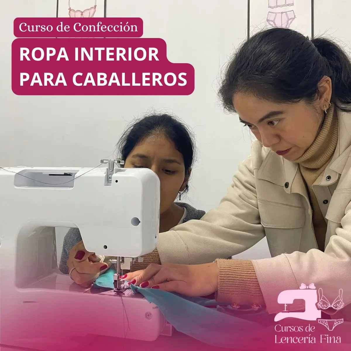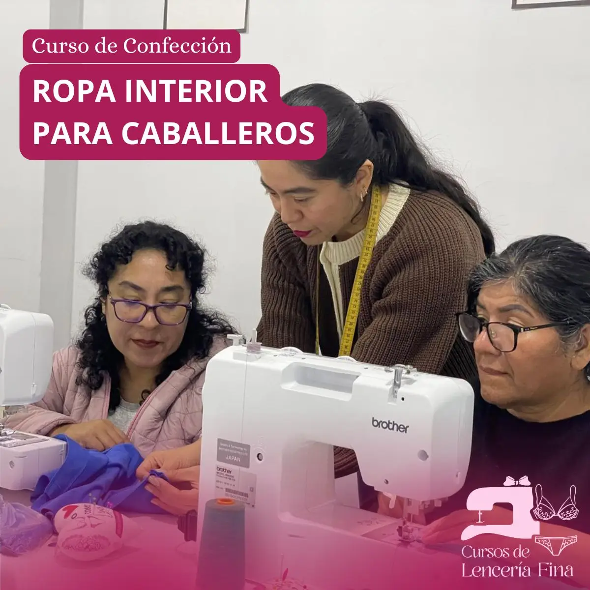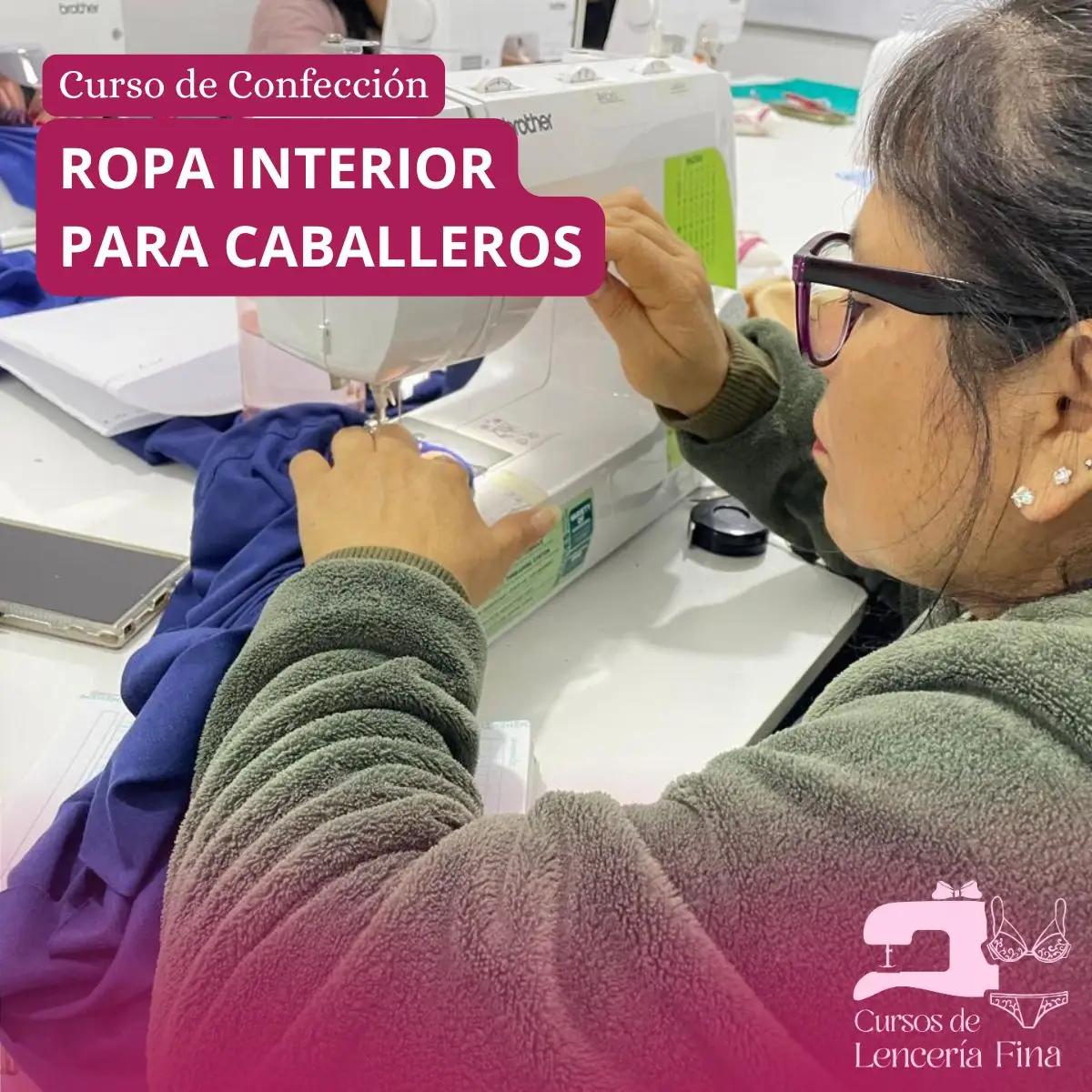 Cursos de confección de Ropa Interior para Caballeros, dirigido para personas que por primera vez van a confeccionar prendas íntimas, se enseña el proceso de armado y acabados de confección de 8 diseños de prendas, entre boxers y calzoncillos, diseños juveniles y conservadores, todos los alumnos realizan el curso presencial haciendo uso de una máquina casera, con la supervisión de la profesora a cargo.