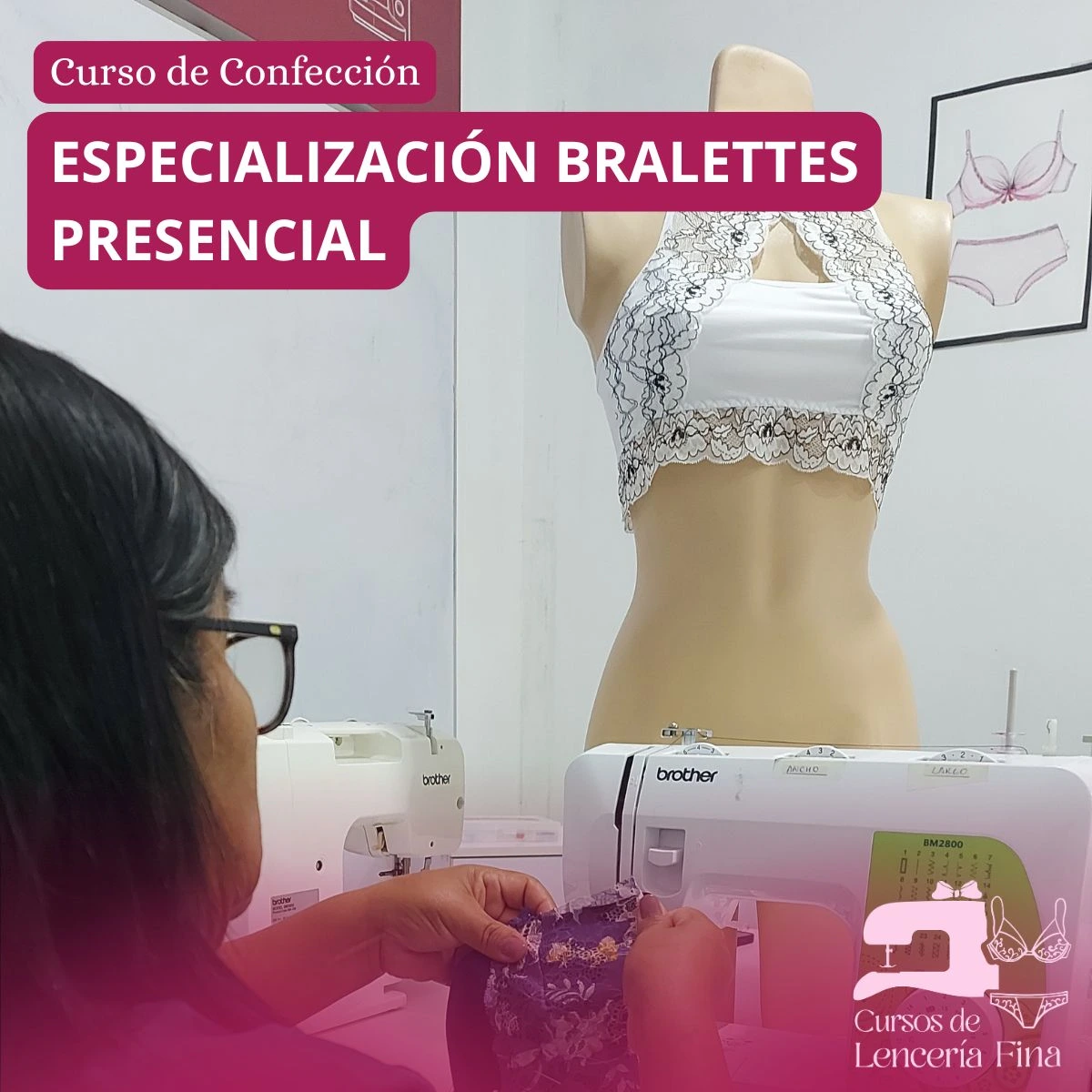 Cursos de Especialización en confección de Bralettes, modalidad presencial, dirigido para personas que ya tienen conocimientos en confección brasieres, se enseña el proceso de armado y acabados de confección de 8 diseños de prendas, todos los alumnos hacen uso de una máquina casera