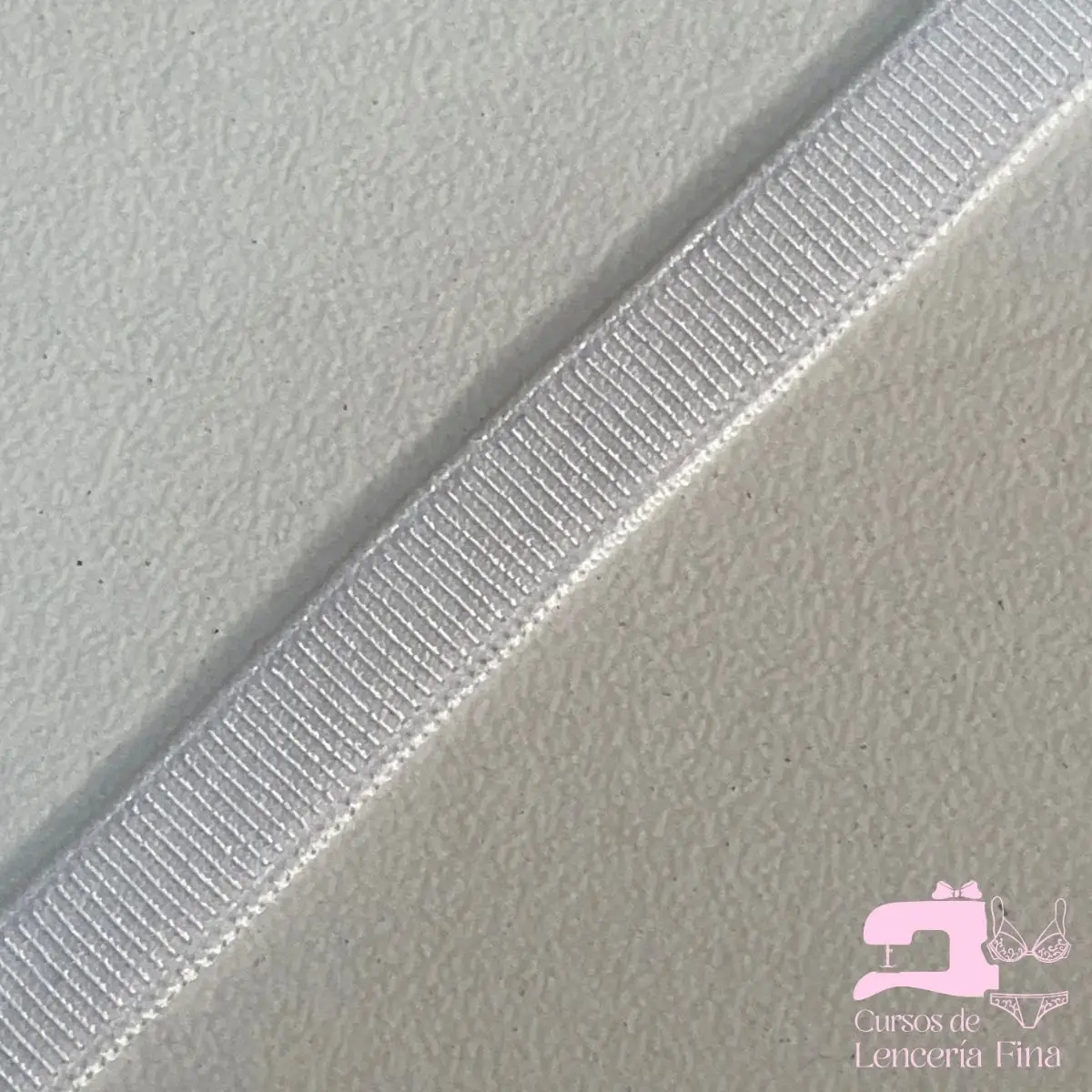 Elástico plano en color Blanco, cinta elástica de 6mm de ancho, delgada y versátil. Ideal para costuras internas, ajustes en brasieres, refuerzos de copas y aplicaciones donde se requiere elasticidad discreta. Flexible, resistente y de fácil manipulación en la confección de lencería.