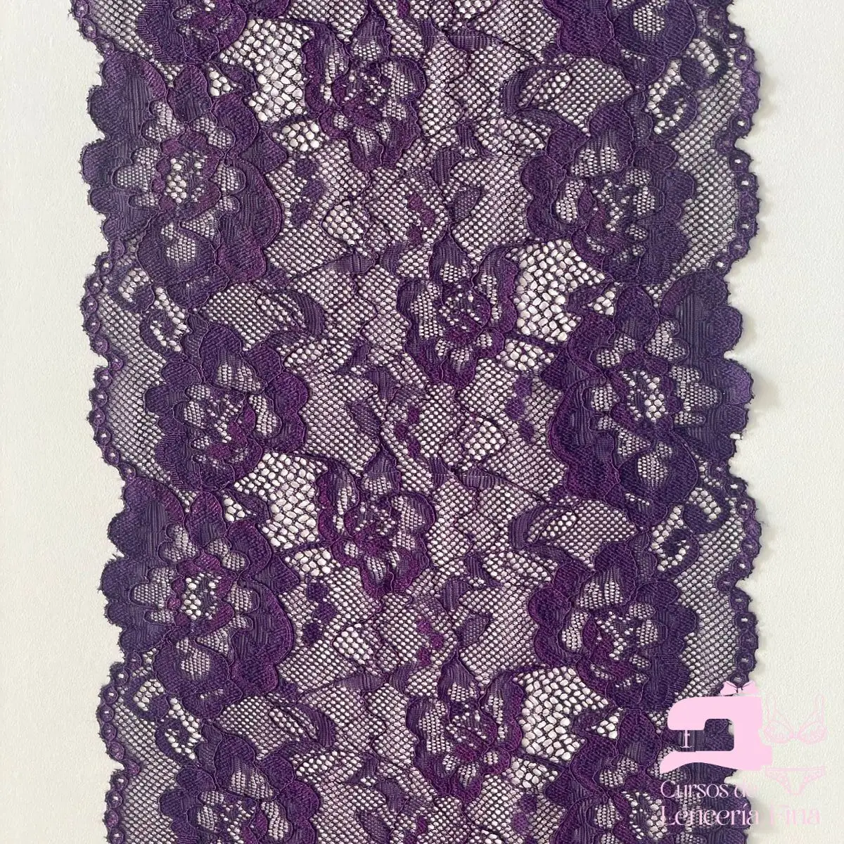 Encaje elástico color entero con diseño Belinda Morado. Tela de encaje con textura suave, ligero relieve y transparencia con diseños florales en un solo tono uniforme. Ideal para brasieres, bralettes y lencería fina. Ofrece elasticidad, comodidad y un acabado delicado y femenino.