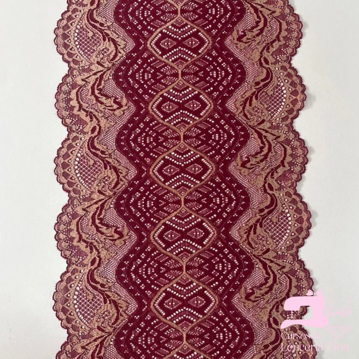 Encaje elástico matizado con diseño Dragón Vino con Beige. Tela de encaje con textura suave que presenta relieve delicado y transparencia con diseños florales y geométricos en combinación de dos tonos. Ideal para brasieres, bralettes, baby dolls y prendas de lencería fina con acabado elegante y sofisticado.
