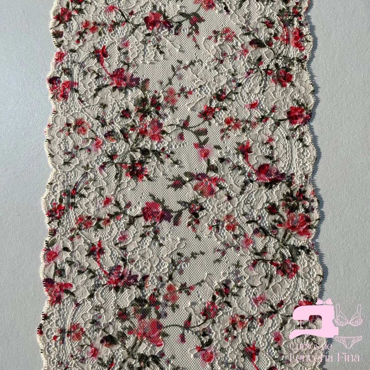 Encaje elástico matizado con diseño Jardín de Seda. Tela de encaje con textura suave que presenta relieve delicado y transparencia con diseños florales y geométricos en combinación de dos tonos. Ideal para brasieres, bralettes, baby dolls y prendas de lencería fina con acabado elegante y sofisticado.