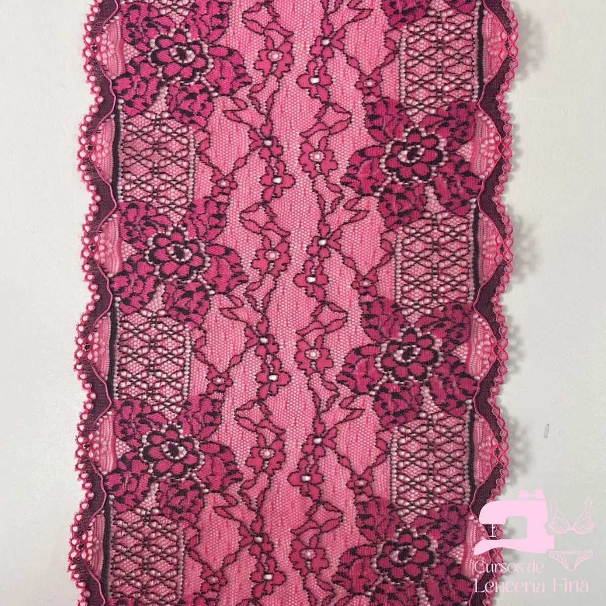 Encaje elástico matizado con diseño Lizbeth Fucsia con Negro. Tela de encaje con textura suave que presenta relieve delicado y transparencia con diseños florales y geométricos en combinación de dos tonos. Ideal para brasieres, bralettes, baby dolls y prendas de lencería fina con acabado elegante y sofisticado.