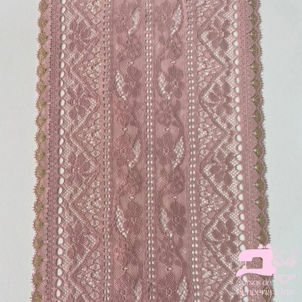Encaje elástico matizado con diseño Palo Rosa con Dorado. Tela de encaje con textura suave que presenta relieve delicado y transparencia con diseños florales y geométricos en combinación de dos tonos. Ideal para brasieres, bralettes, baby dolls y prendas de lencería fina con acabado elegante y sofisticado.
