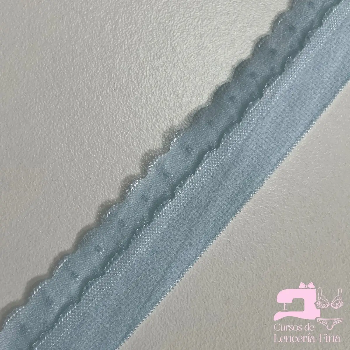 Sesgo doble mora en color Celeste, cinta elástica de 20mm con línea de quiebre en el centro y textura de doble mora en ambos lados. Proporciona acabados resistentes y profesionales en prendas de lencería. Mayor ancho y doble textura para un agarre superior y terminaciones duraderas.