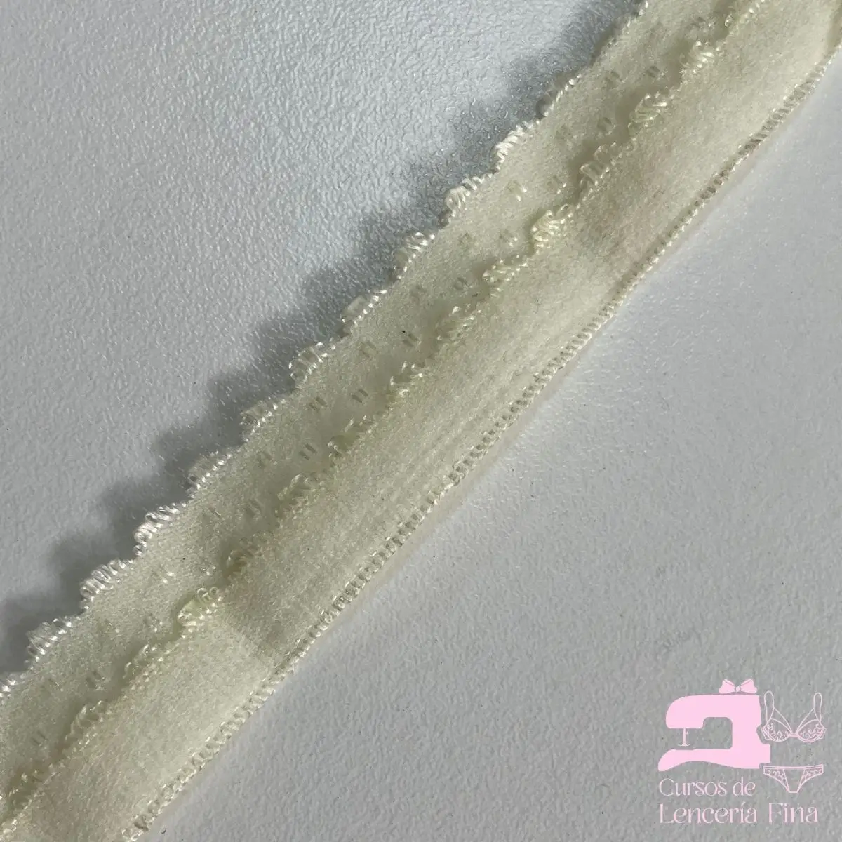 Sesgo doble mora en color Perla, cinta elástica de 20mm con línea de quiebre en el centro y textura de doble mora en ambos lados. Proporciona acabados resistentes y profesionales en prendas de lencería. Mayor ancho y doble textura para un agarre superior y terminaciones duraderas.