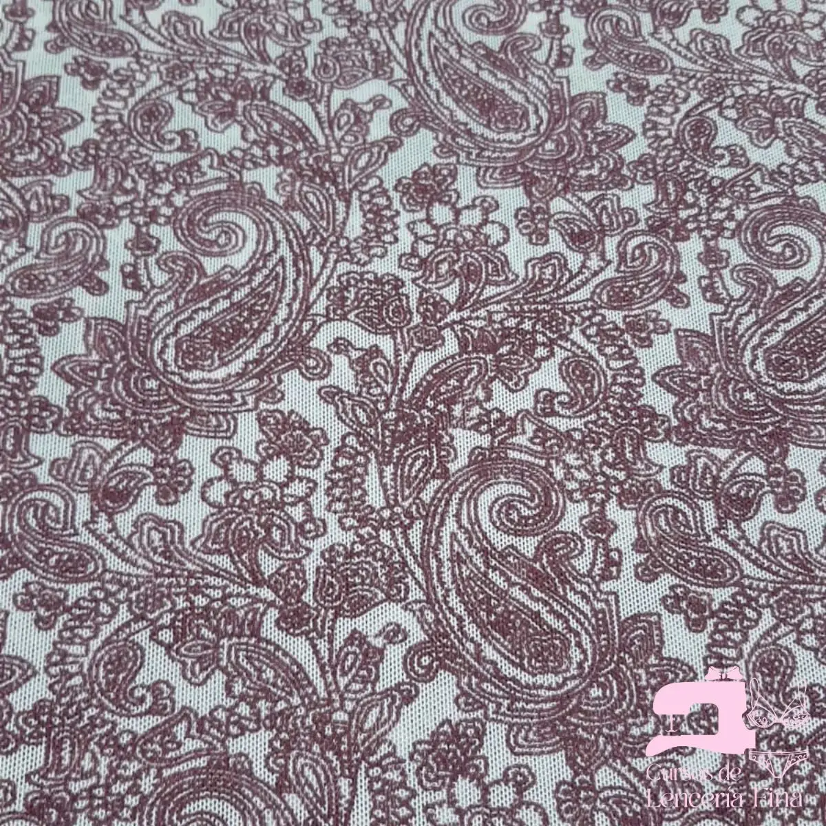 Tul licrado estampado con diseño Arabesco Guinda. También conocida como transparencia licrada, se destaca por su elasticidad y textura semitransparente con diseños impresos. Ideal para detalles y paneles decorativos en brasieres, bralettes, baby dolls y lencería fina.